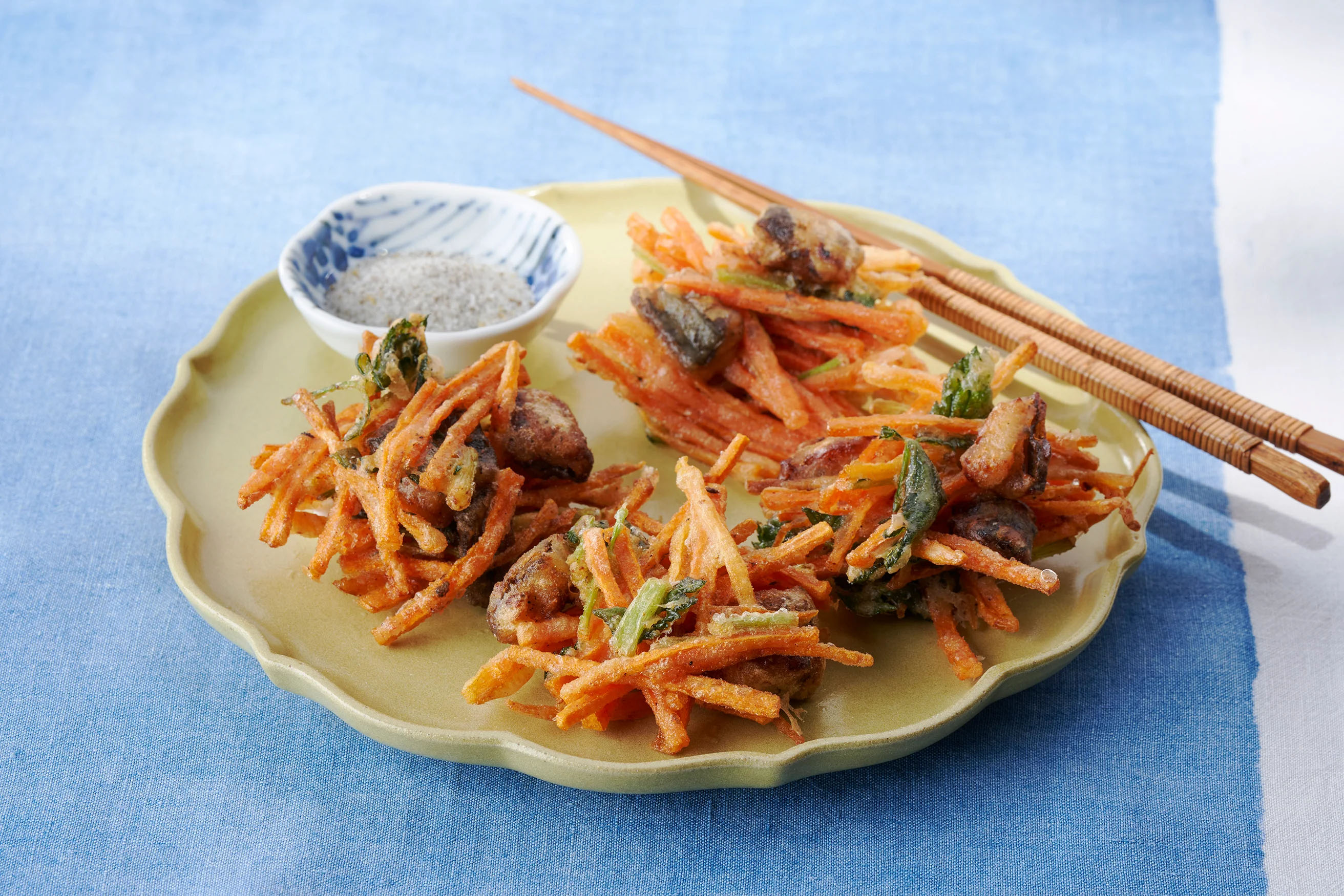 三つ葉、や刻みのりをのせて、緑茶を注ぎます。