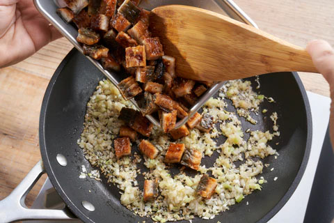 麻婆豆腐うなぎ 調理時間 15 分 挽肉と豆腐で作るマーボー豆腐のひき肉をうなぎにアレンジして仕上げます。ざく切りにしたうなぎと長ねぎ、しょうが、にんにくと和風顆粒だし、豆腐と煮込み、豆板醤、山椒などで味つけ和風寄りの麻婆豆腐風に仕上げます。 レシピに使用している商品 鹿児島県産 うなぎ長蒲焼【大】 2尾セット【0001ST】 商品ページへ → 材料(2人分) うなぎの蒲焼1枚 長ねぎ1/2本 しょうが1/2かけ にんにく1/2片 木綿豆腐1/2丁(200g) ごま油大さじ1 A 鶏がらスープの素小さじ1/2 水1/2カップ オイスターソース大さじ1/2 豆板醤小さじ2 B 片栗粉大さじ1 水大さじ1 山椒適量 作り方 長ねぎとしょうが、にんにくはみじん切りにする。 豆腐は2㎝角に切り、熱湯でさっと茹でる。うなぎは1㎝角に切る。 フライパンにごま油を熱し、長ねぎ、しょうが、にんにくを炒め、しんなりとしたらうなぎと[A]、豆腐を加えてひと煮立ちさせ、1~2分煮たら[B]を少しずつ加えてとろみをつける。 2を器に盛り付け、山椒をかける。 レシピ考案者 渥美 まゆ美 様 株式会社Smile meal代表取締役 管理栄養士、フードコーディネーター、料理家、フードプロデューサー 商品開発や出版、レシピ開発、メディア出演など多岐に渡り活動。2016年 株式会社Smile meal設立。 食を通して人々の健康につながる料理の提案や売れる商品作りのお手伝い、健 康セミナー講師や料理教室で企業の健康経営サポートも手掛ける。 テレビ出演多数。出版「朝つめるだけ弁当188」「世界一ラクチンな栄養ごはん 」(西東社)他多数。 一覧へ戻る