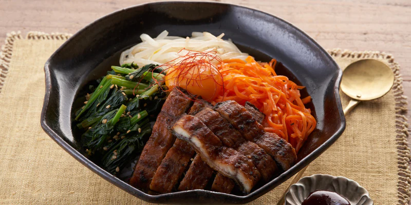 野菜たっぷりのビビンバ、ナムルの酸味とうなぎの蒲焼の甘さ、コチュジャンの辛さのバランスが最高の1品です。