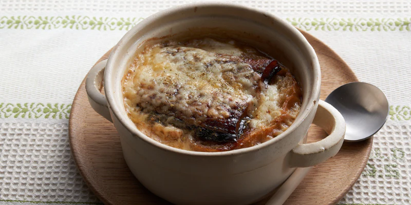 うなぎの蒲焼きを使ったスープです。うなぎの甘辛味とチーズの塩味、オニオンスープの美味しさのハーモニーがたまりません。