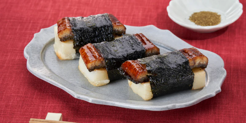 - おもちにうなぎの蒲焼のタレをくぐらせ、うなぎを乗せ、焼きのりで巻きましょう。